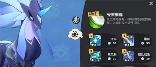疾光千兽之所以被称为光系高爆发代表,是因为它有着精妙的设计技能池,并且三种形态的技能机制也是一致的。队伍的核心队员配招要考虑输出和属性的提升。首选必带技能光束聚集,开局就可以释放,可以增加自身10%的魔攻数值,并且持续3回合,是开始爆发流程的钥匙。核心输出技能逆光不但能造成固定的伤害,还可以附加星陨标记,一层标记可以提高5%的伤害,最多叠加3层,是它的主要输出方式。
