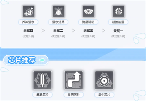 在技能升级这块,优先升级她的三技能,其次是二技能,最后才是1技能,这样的顺序优先级,让这个角色操控起来更加顺手,使用效率也会更高,优先升级天赋4,然后是天赋2;芯片比较适合“暴怒芯片”,“灵巧芯片”,“集中芯片”。